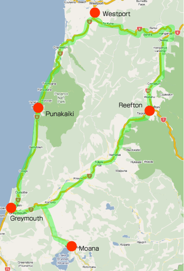 GreymouthからPunakaikiまでライディング。海岸線、パパロア国立公園のレインフォレストが見所。走行距離約50km。Punakaiki泊。 |