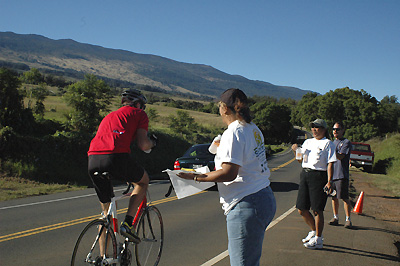 このレースは多くのボランティアによって支えられている。コース上に6ヶ所設けられたエイドステーションではスタッフが水、スポーツドリンク、バナナ、パワーバーなどのサプリメントを用意して待っていてくれる。“looking good!” “go! go! go!”と大声で応援してくれるのでとてもうれしい。