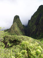 Island)」と呼ばれる所以(ゆえん)だ。本物のイアオ・ニードルは谷間にちょこんと突き出た針のように尖(とが)った小山で、想像していたよりも小さかったが実に面白い地形だ。他の山影(やまかげ)も日本のそれと異なり興味深かった。遊歩道にはここが古戦場である云々(うんぬん)を記した説明板がある。川の流れを朱(しゅ)に染める激戦地であったという。