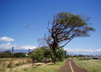 カフルイの街が近づいてくると、右側遠くに大きな煙突を持つ工場があった。煙は一直線に南西方向にたなびき、大昔からずっと同様に風が吹いているのだろう、沿道の樹木も同じ形をしている。その延長線上からアロハ航空のB737が進入してきた。すべて貿易風の仕業であるが、これほど視覚に訴える絵は珍しいと思い、振り返って写真を撮った。左下に煙突と煙が見えているのがお分かりだろうか?