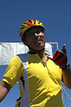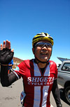 氏名■鈴木賢一 タイム3:39:58 参加レポートがベルエキップのHPに掲載されています→こちら 年齢■38 居住地■宮城県仙台市 感想■(レポートより抜粋)自分ではゴールまであと500m 以上あるだろうと思っていたら,観客(おそらくすでにゴールした選手)が, 「ここをのぼれば,もうゴールだ.最後だ.全力を出せ.おまえのすべてを出 せ!」と叫んでいる."Your everything! everything!"の気合いに押されて, ペースアップ.脚がひくついていたが,構うものか.そのままなんとかゴール に飛込んだ.タイムは3:39:58.目標はクリアしたものの,脚が攣ったり,ハンガーノック になったりと,反省点は多い.しかし,それもコースのタフさの証明と思うこ とにした. 使用バイク■ALAN 日本のライダーへ■ビーチのすぐそばのスタート地点から,月面を思わせる荒涼とした 山頂のゴール地点に至る終わりの見えない登りは,やはり格別だ.坂好きなら一度は経験して損はないだろう.