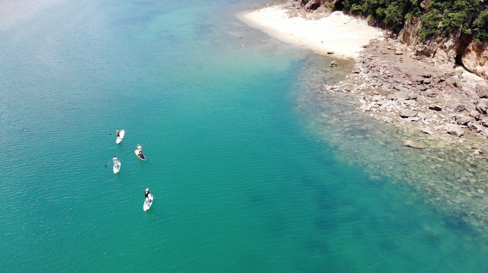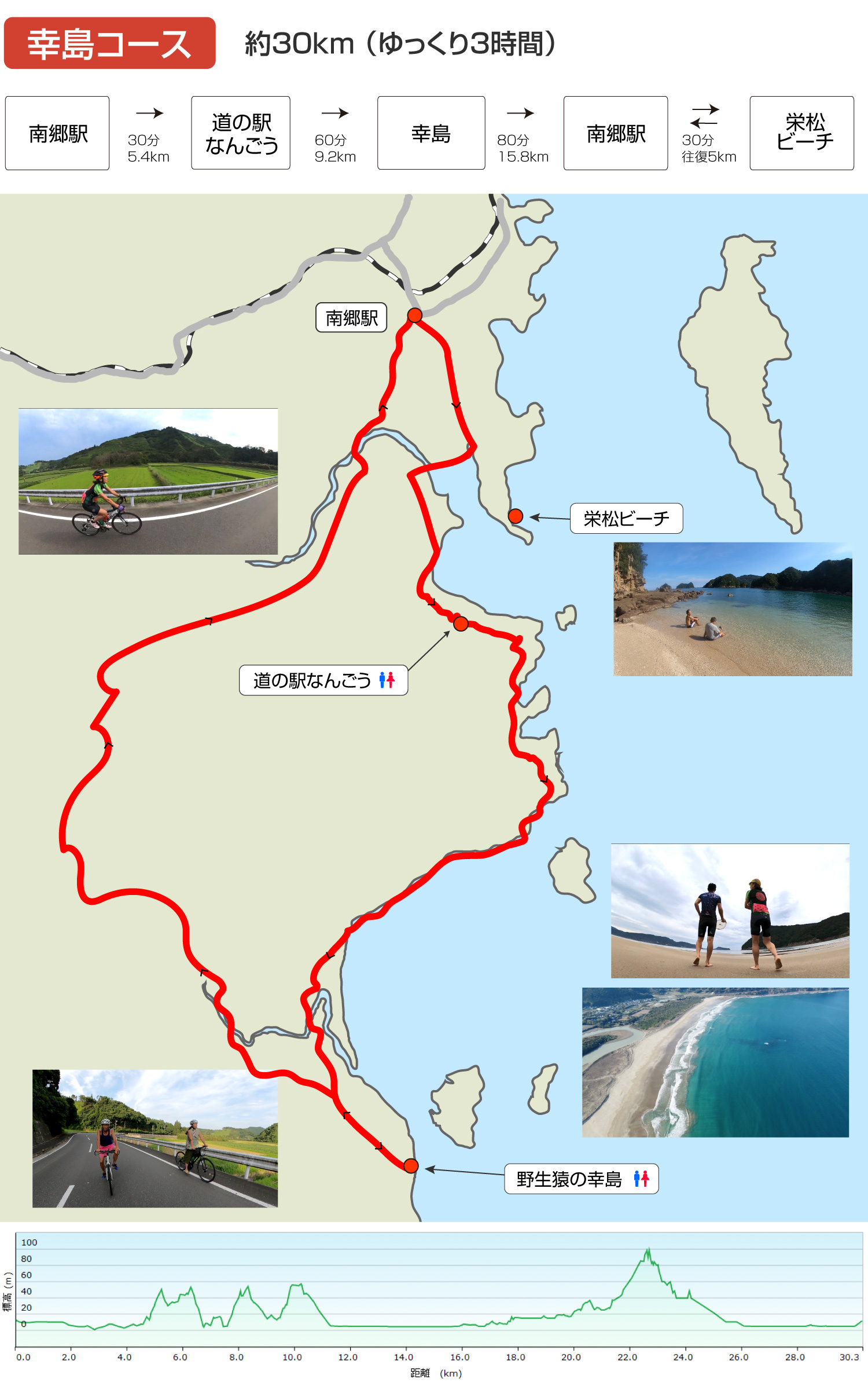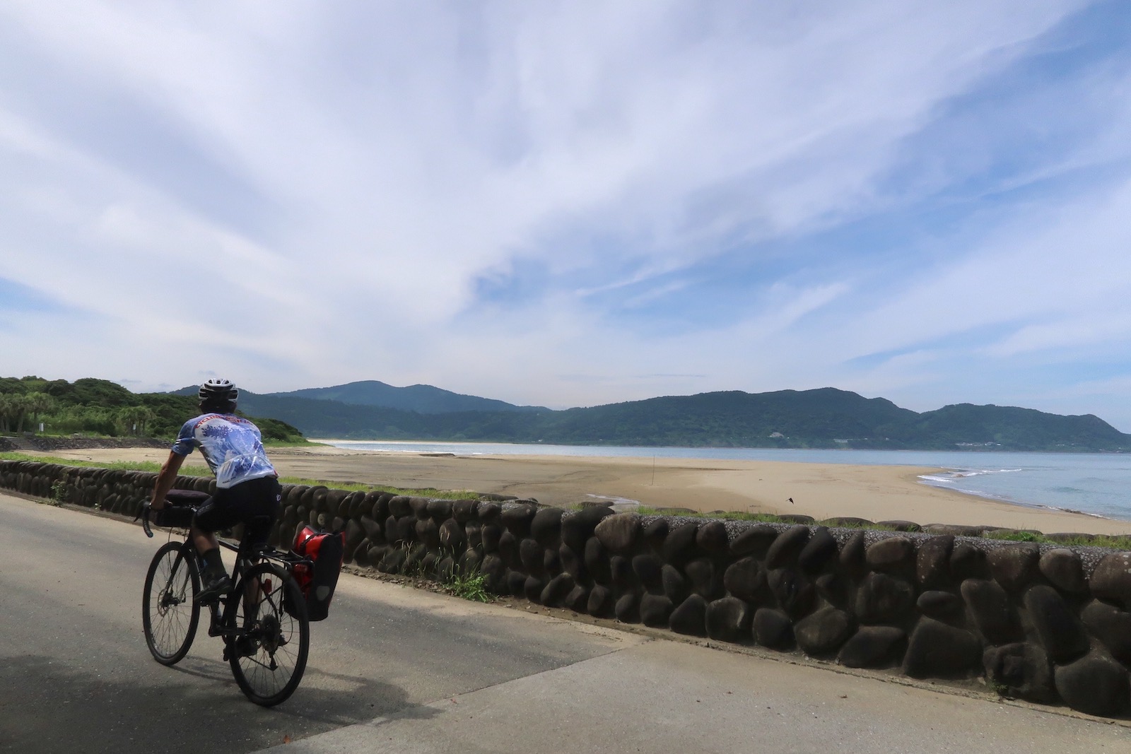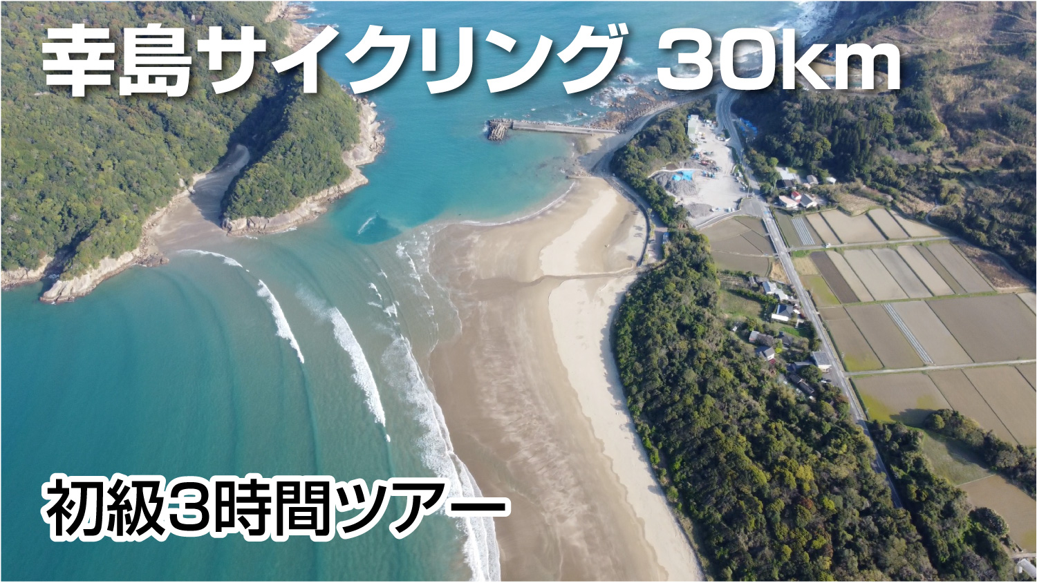 宮崎県の南部、日南海岸にある幸島は野生の猿が住み、白い砂浜が広がる自然豊かな場所。いくつもの小さな漁港と入江が続く海岸線のサイクリングを楽しんだ後に、幸島周辺のビーチが目の前に広がります。ビーチを裸足で歩いてもいいし、渡し船で幸島に渡れば野生の猿を観察することもできます。集落には水田や畑があり、静かな田舎道を季節ごとの風景とともに走り抜けます。スタート、ゴールの南郷駅の近くにも美しい栄松ビーチがあり、おすすめスポット。SUPで対岸の無人島に渡れば大満足の冒険の休日となります。