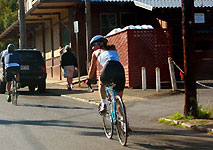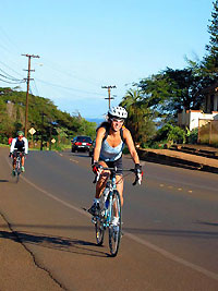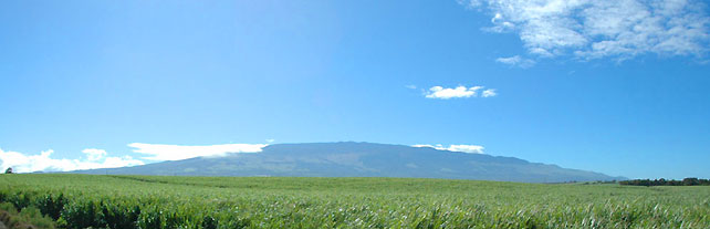 ひょうたん型の島の大きい方。その真ん中にあるハレアカラ。まるで小高い丘のようだけど3000m超です。スタート地点は、サイクル・トゥ・ザ・サン同様パイアの町。最初は振り返るとかろうじて海が見えるくらいだけど(左)、教会や学校などがあり、楽しい田舎道です。ずんずん登っていくと、サトウキビ畑やパイナップル畑も。さらに上ると、約800m地点のマカワオの町に到着です(右下)。 |