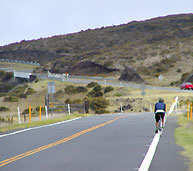 この日、走り始めたのは朝8:00です。サイクル・トゥ・ザ・サンは7:00スタート。早朝じゃないとやっぱり暑くて走りにくいです。エリート選手は2時間ちょいで上ってしまうけど、2000mを超えると気温も下がり体力を奪われます。最後の最後に待ちかまえてる激坂は、高度があるため歩くだけでも息切れするほど。そんなことも考えて、レースじゃない場合は5〜6時間(それ以上)みておくといいと思います。ちなみに、乗鞍などに参加しているベテランヒルクライマーで3時間台、初挑戦のビギナー・ヒルクライマーで6時間半。必死に漕ぎまくってです。また、クラの町(1000mくらい)までは食べ物や水を売っているお店もるけれど、それ以上は本気で何もありません。だけど、車は通るし、ハレアカラ・ダウンヒルの通るし、観光客もいるので寂しい道じゃありません。 |