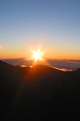 ハレアカラ・バイクのツアーに参加しました。ここはチャリがMTBです。それと自分のペースで好きなように下ってOK。他社はコースターブレーキのビーチクルーザータイプがほとんどで、ガイドさんを先頭に列になって下ってきます。というわけで早朝4時にショップへ。グローブやヘルメットをフィッティング。かなりスピードが出るのでフルフェースです。合羽上下やデイパックも貸してくれます。バンに揺られて1時間ちょいくらいかな? 頂上に到着。雲海から昇る太陽の神々しさといったら…。人々の顔を温かく美しく照らしてくれます。 |