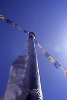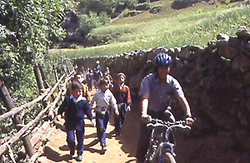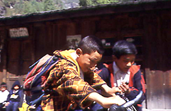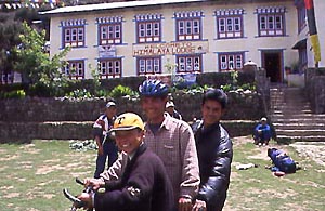 異次元空間(1日目) 標高2800mのルクラに降り立つと、カトマンズとは空気がまったく変わりひんやりしている。早速バイクを組み立てていると、10人ほどの村人に囲まれた。どうやら自転車自体珍しいようだ。 いよいよ出発だ。はじめはしばらくゆるい下りだった。トレイルを行くシェルパ人たちに「ナマステ!」と挨拶すると元気に「ナマステ!」と返ってくる。ひたすらのどかな景色の中で、軽いトランス状態になっているのが自分でよくわかる。途中出会ったチベット仏教の小僧さんたちが、僕のバイクに乗ろうとしてバイクと格闘していた。アップダウンを繰り返してドゥドコシ沿いをさかのぼり、高原のペンション村のようなパグディングのロッジで一泊する。