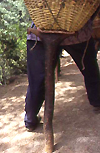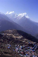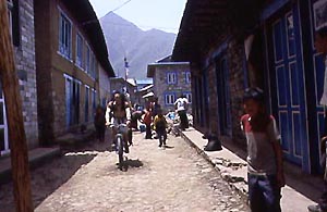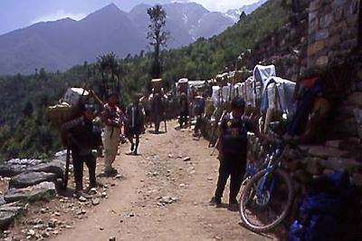 シェルパ人(2日目) ナビョのアドバイスに従って、ナムチェまでの急坂はポーターを雇った。パグディングで出会ったシェルパ人とナムチェまで500ルピー(約750円)でバイクを運んでもらう契約を結んだ。毎日50kg以上の荷を運ぶ彼にとってバイクはなんともないらしい。シェルパスタイルで、額にストラップをあて持ち上げると「オー、べリーライト!」と言って、早速歩き出した。ドゥドコシ沿いをさかのぼり大きなつり橋を渡ると、急な上りが始まる。これはナビョの言ったとおりライディングどころか、担いであがるのも難しそうだ。標高はまだ3000mほどだがかなり息があがる。15分ほど上っては休みを繰り返してゆっくり行く。ポーターは額に汗を浮かべながら、笑顔で「ビスターリ、ビスターリ(ゆっくり)」と僕を励ましてくれる。パグディングから800mほど高度を上げて、標高3440mのシェルパ人の町・ナムチェにたどり着いた。少し高台に上って町全体を見渡してみると、クンブ渓谷の中に大都市が浮かんでいるようだ。